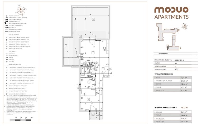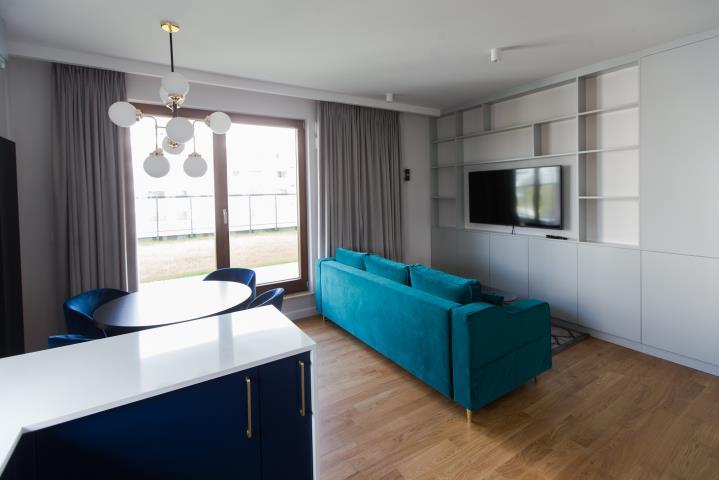 Układ mieszkania: przestronny salon z aneksem kuchennym, dwie oddzielne sypialnie, komfortowa łazienka, duży taras 24 m idealny na odpoczynek lub pracę na świeżym powietrzu.