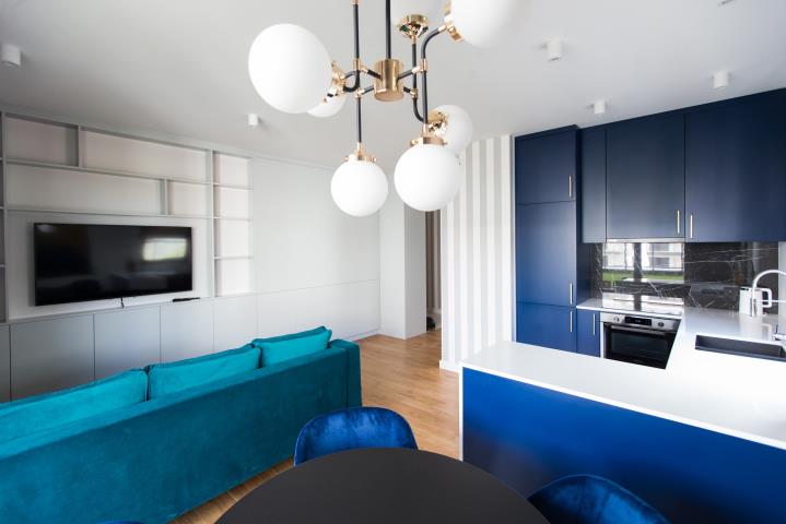 Do wynajęcia nowoczesne, w pełni urządzone mieszkanie o powierzchni 60 m, zlokalizowane przy ul. Cybernetyki 6 na Mokotowie. Lokal znajduje się na 5. piętrze w nowoczesnym budynku i został wykończony w bardzo wysokim standardzie.