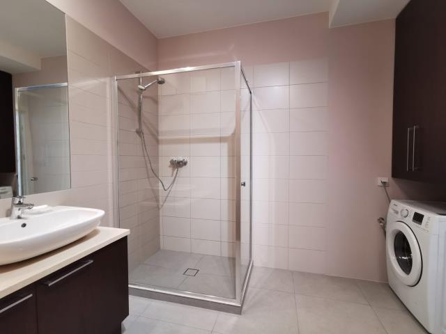 Łazienka z dużą kabiną natryskową, pralką i wygodną zabudową szafkami..