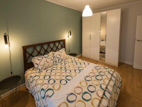 W sypialni umieszczono oryginalne podwójne pełnowymiarowe łóżko 160x200m z litego drewna ( import z Azji) i szafę w zabudowie. Druga szafa znajduje się w przedpokoju.